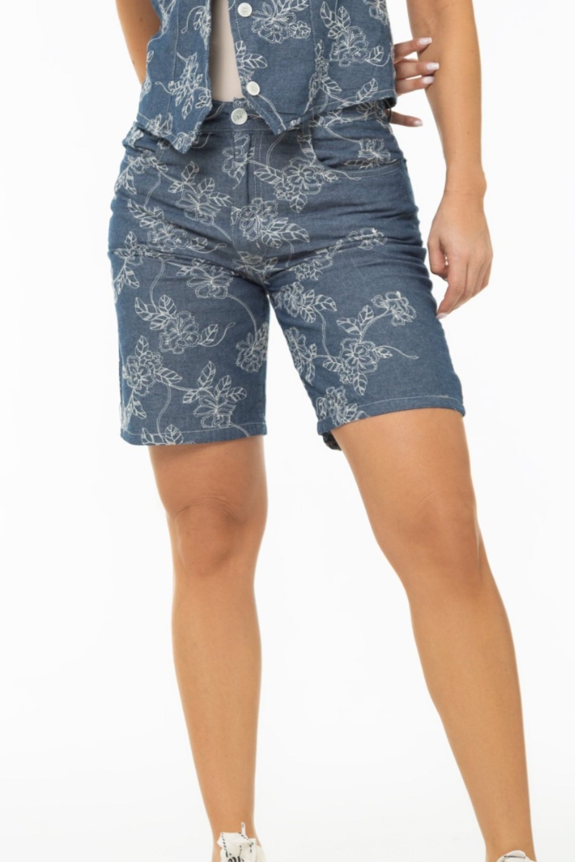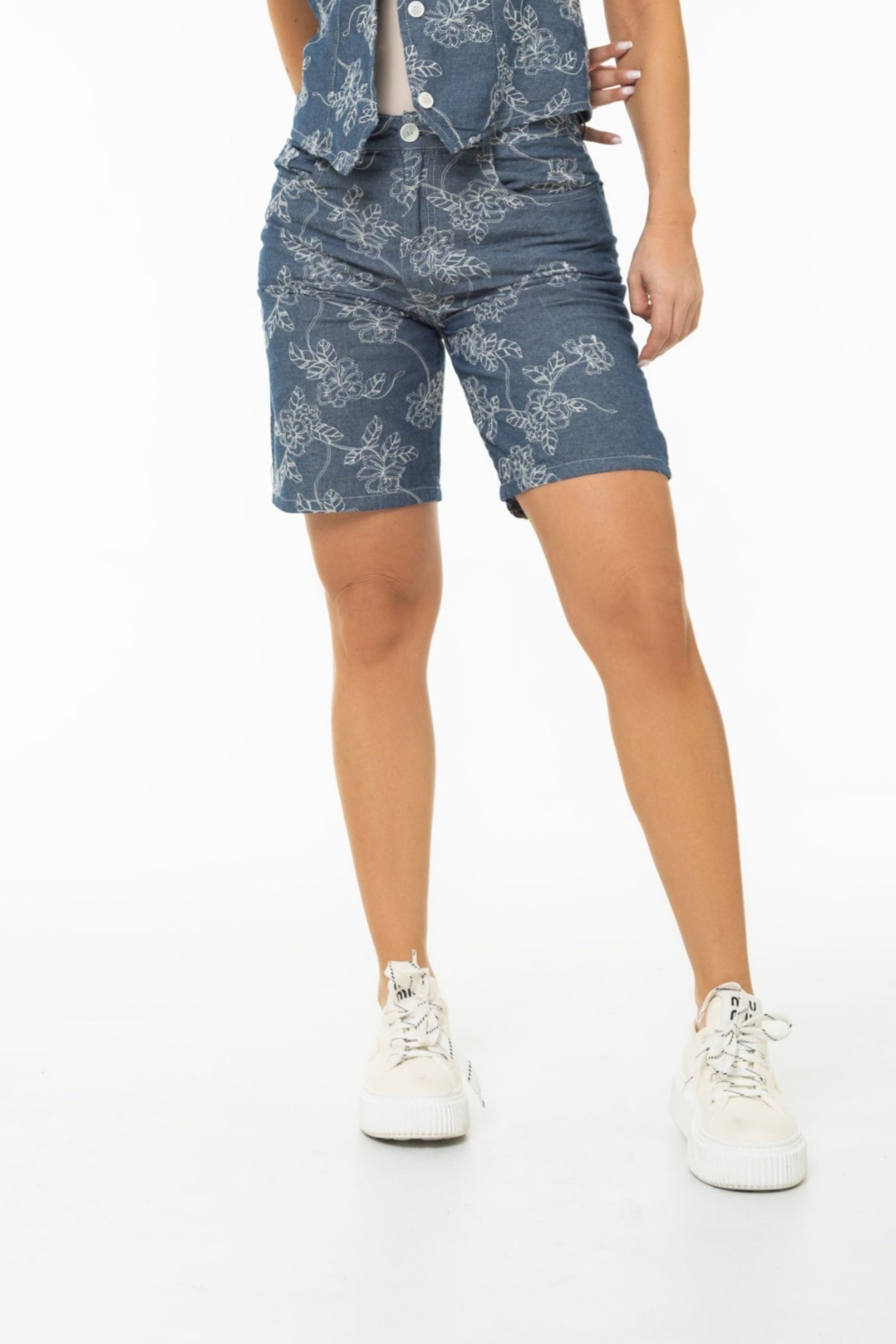Bermuda rígida. Diseño en tela bordada con acabados florales. 2 bolsillos funcionales. Color azul medio. Un estilo fresco y femenino, perfecto para looks casuales y formales.