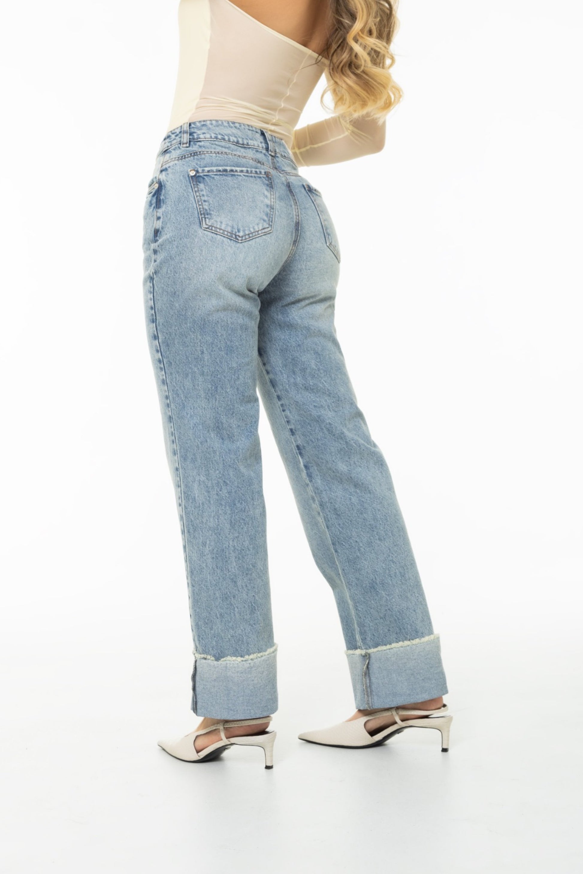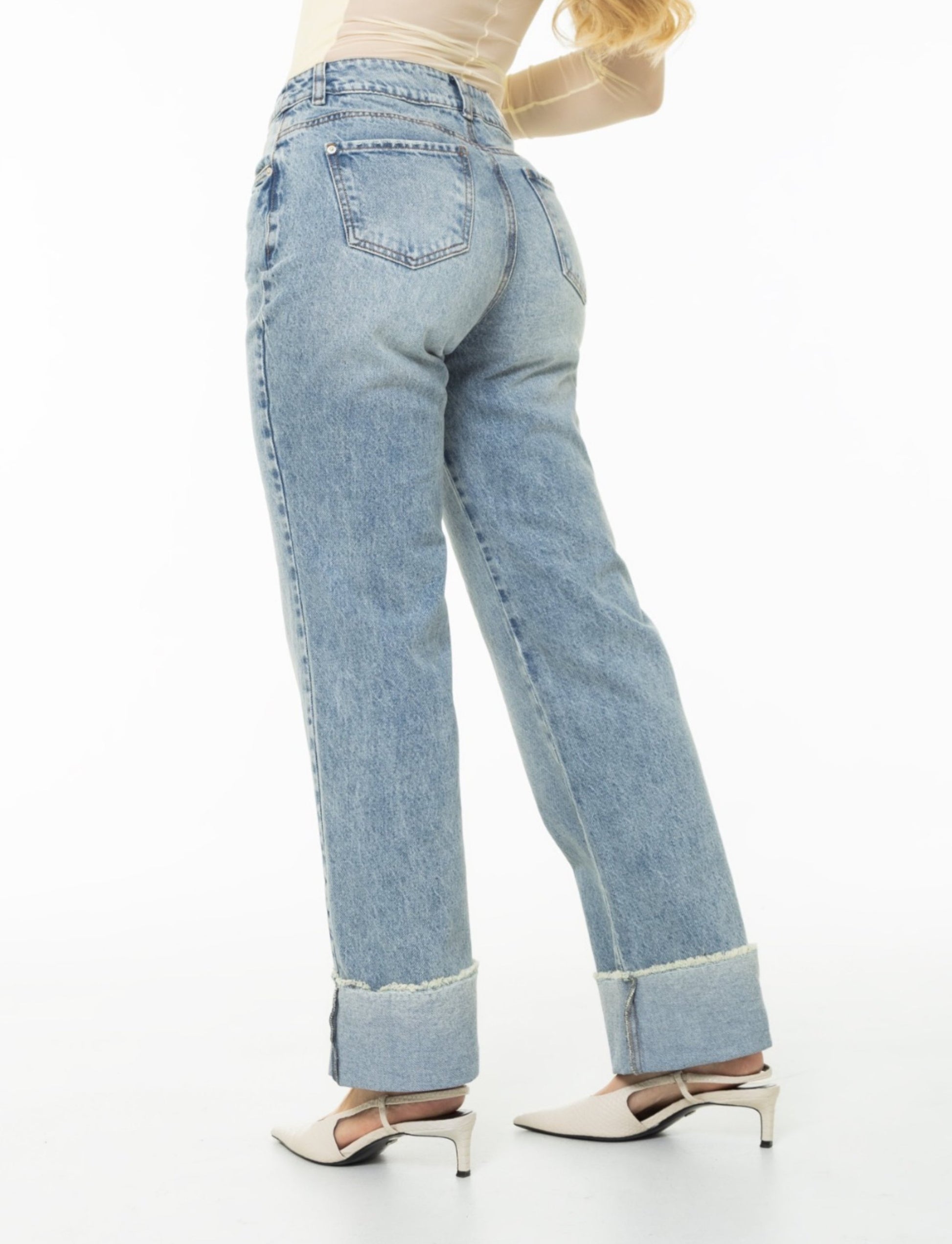 Jean Wide Leg con bota doblada. Pretina con 1 botón. Confeccionado en tono azul claro, un color único y en tendencia. 100% rígido. Horma que realza la silueta para un look moderno y estilizado. Una pieza distintiva y actual, ideal para crear outfits frescos y llenos de estilo.