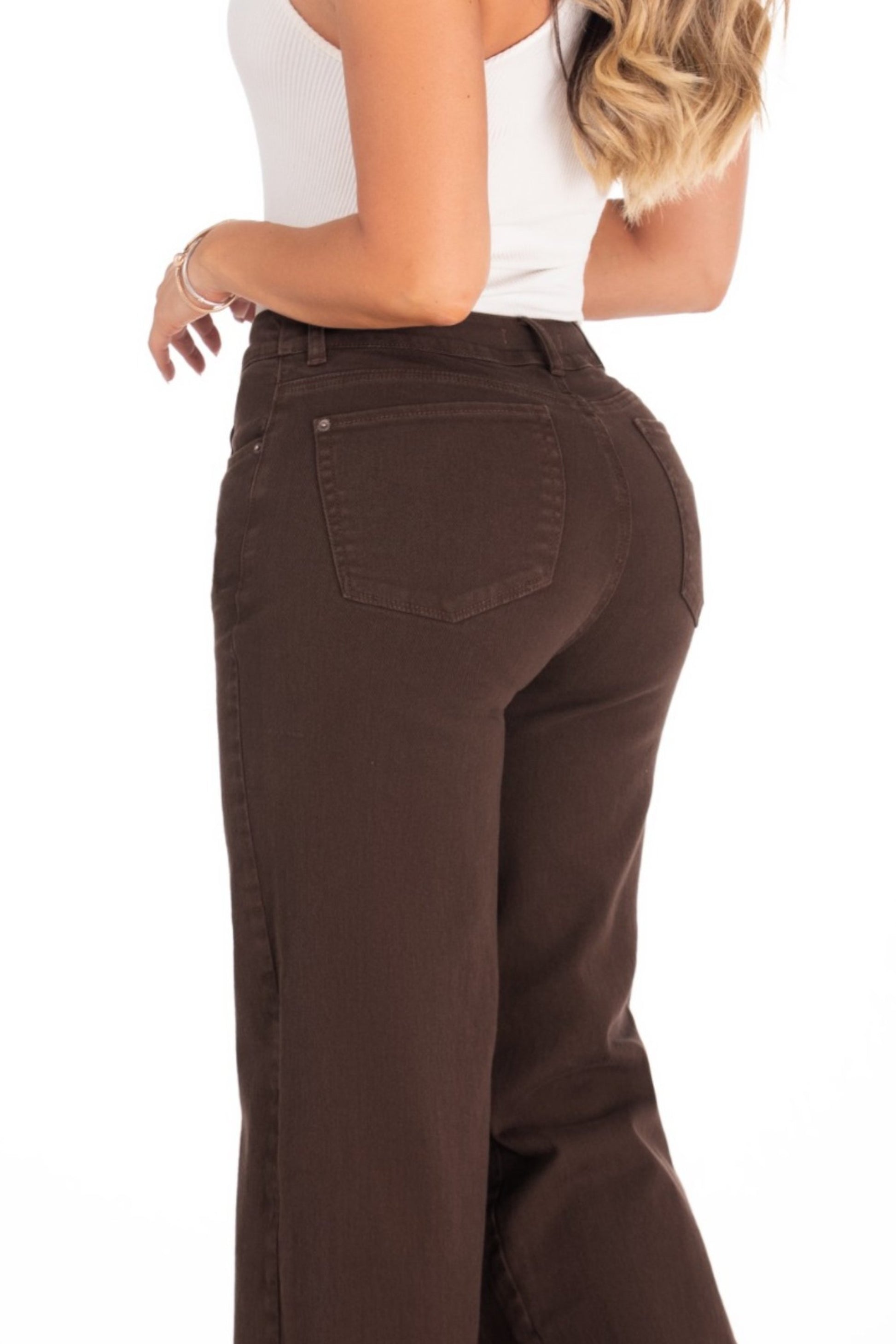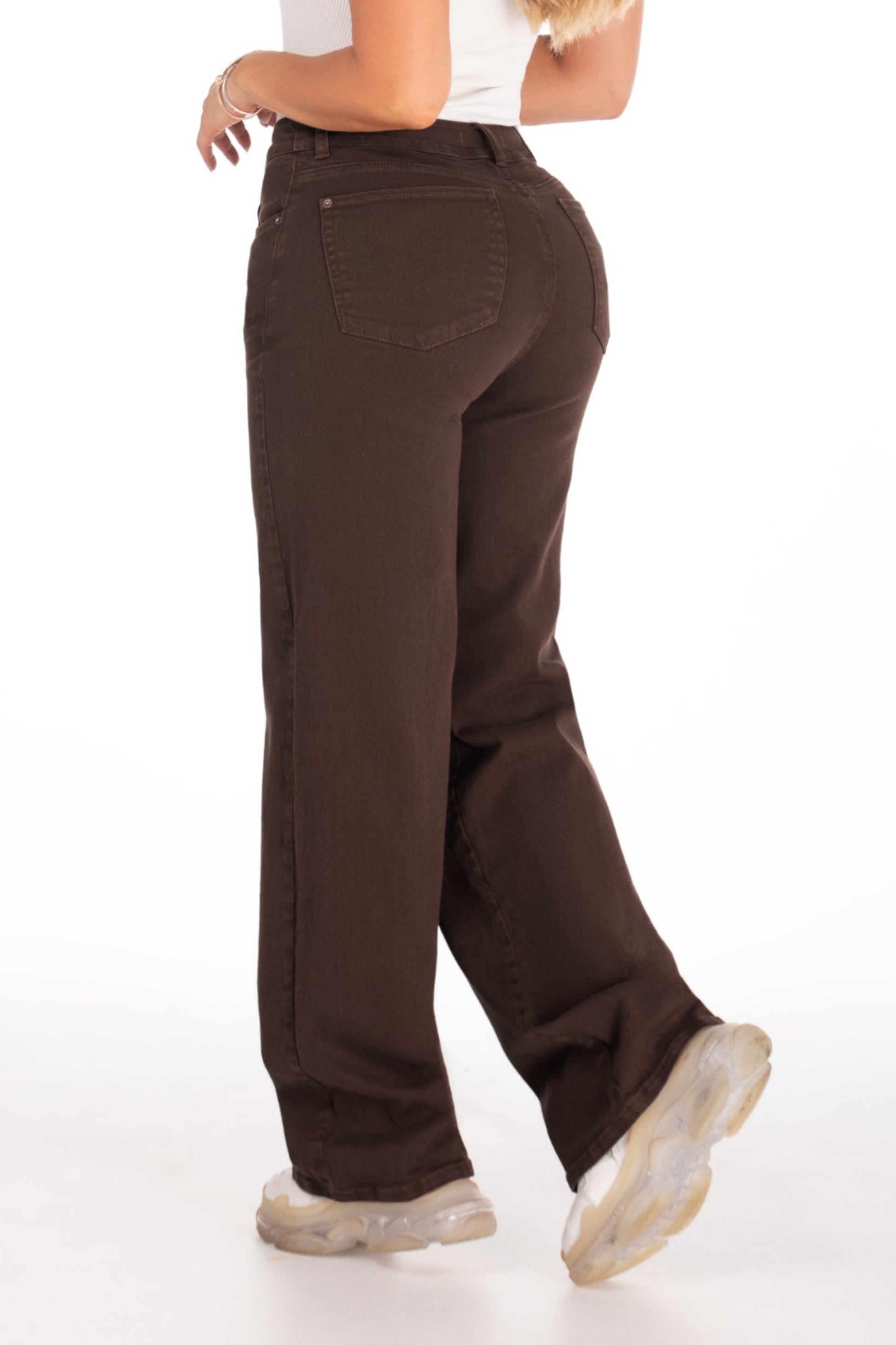 Jean Wide Leg. Confeccionado en tela stretch que aporta comodidad y ajuste perfecto. Color café oscuro, un tono en tendencia que resalta la silueta. Pretina con 1 botón para una mejor horma. Un diseño moderno y sofisticado, ideal para looks versátiles y urbanos.