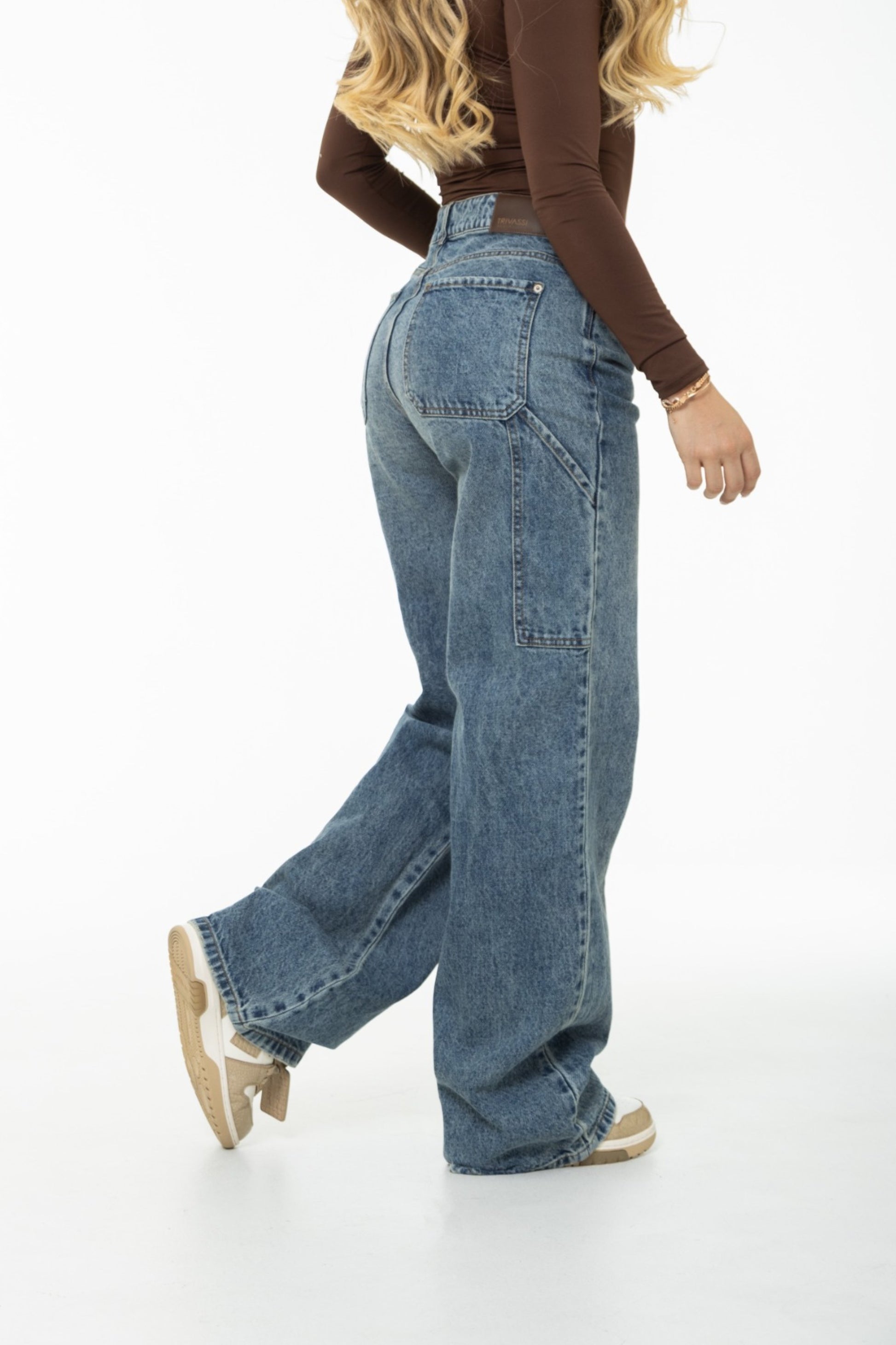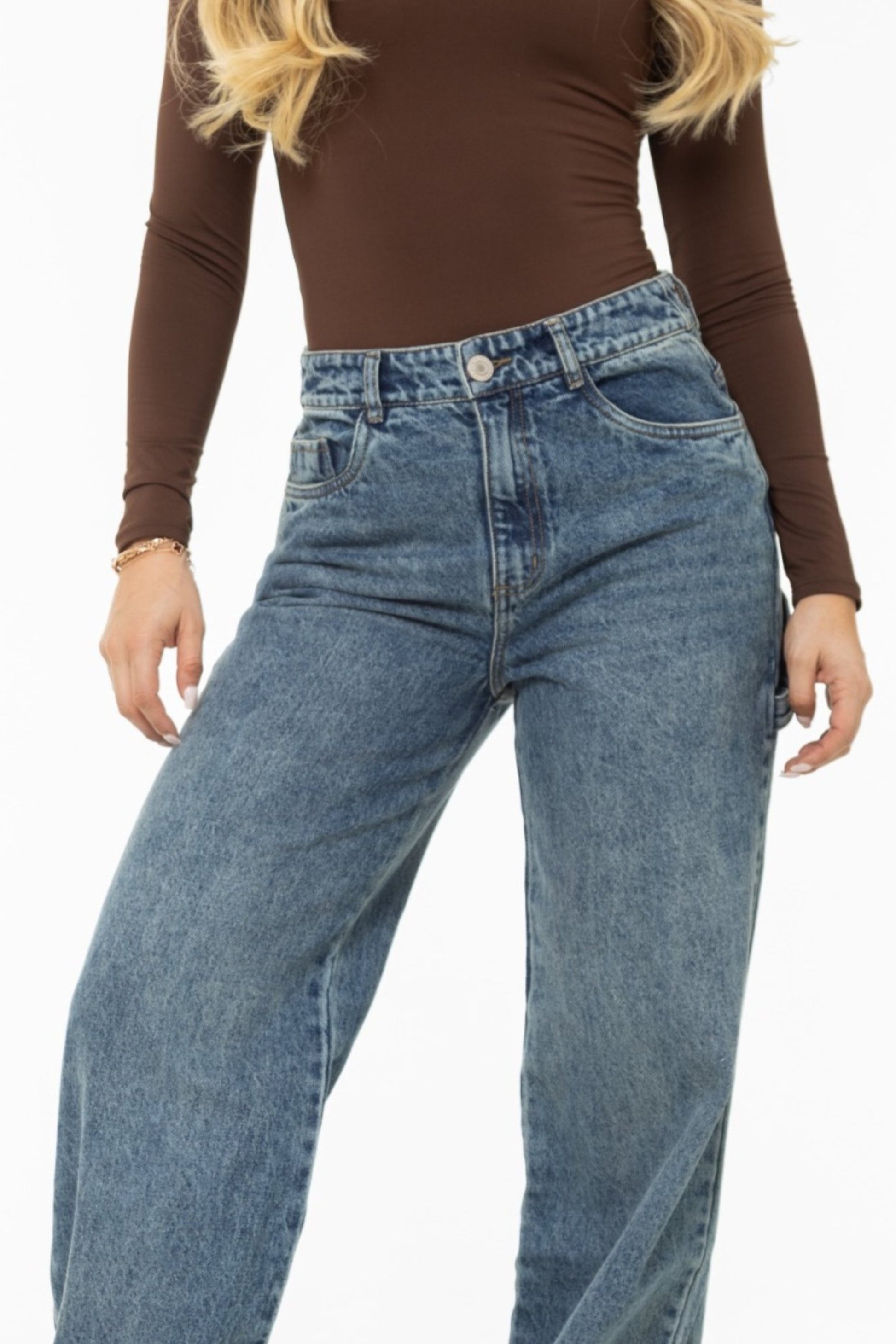Jean Wide Leg Carpenter. Último diseño en tendencia. Confeccionado en tela 100 % rígida de tono oscuro. Detalles de bolsillo y charretera en los costados. Pretina con 1 botón para un ajuste perfecto. Una prenda vanguardista que combina comodidad y estilo, ideal para looks urbanos y modernos.